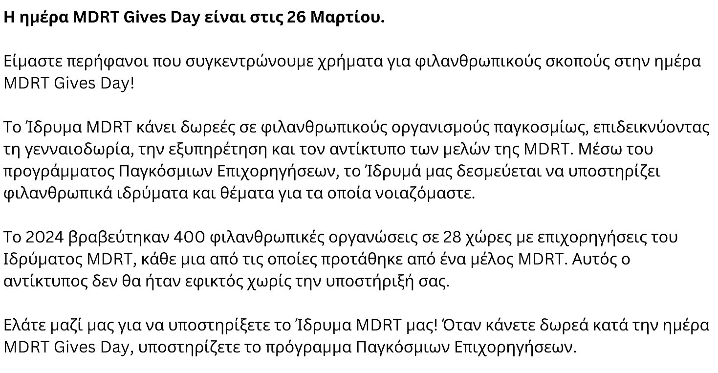 Please join us in supporting our MDRT Foundation! When you donate on MDRT Gives Day, you support the Global Grants Program.